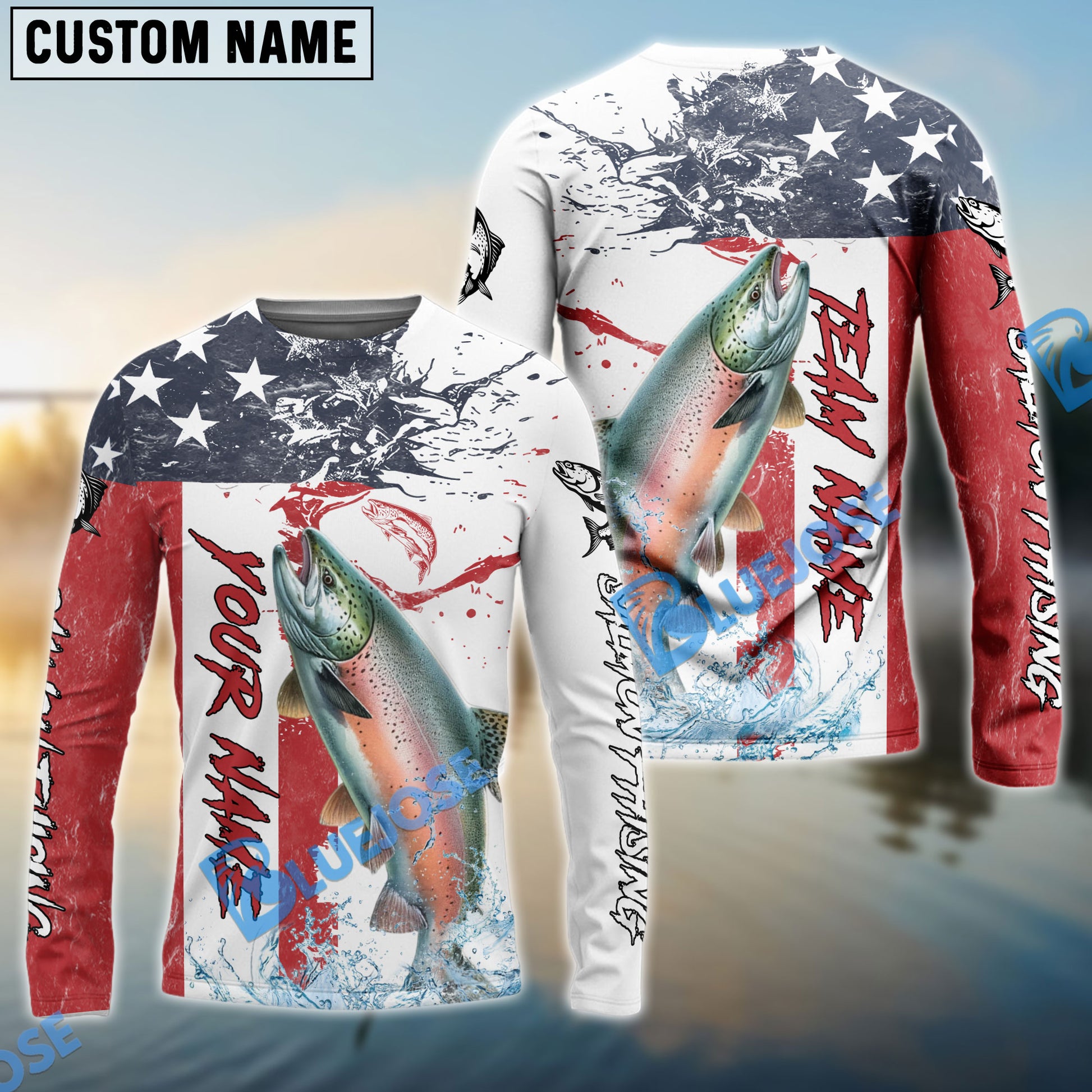 Bluejose Salmon Fishing American Flag Red Blue Seawave Custom Name & Team Name 3D Shirts