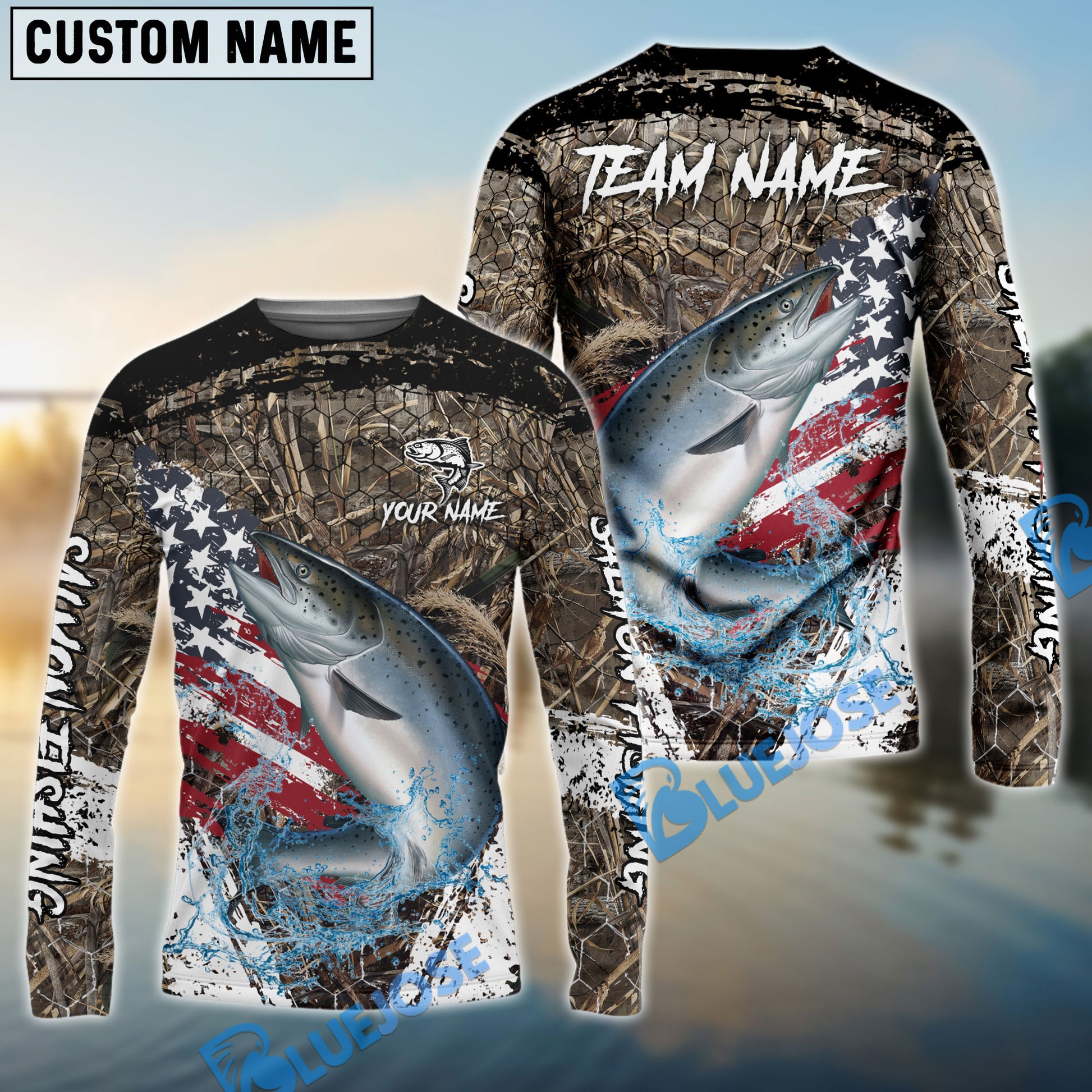 Bluejose Salmon Fishing American Flag Scratch Grass Camo Custom Name & Team Name 3D Shirts
