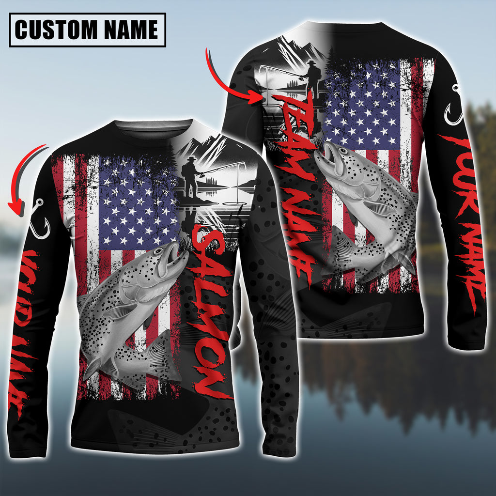 Bluejose Salmon Fishing Black US Flag Sport Custom Name & Team Name 3D Shirts