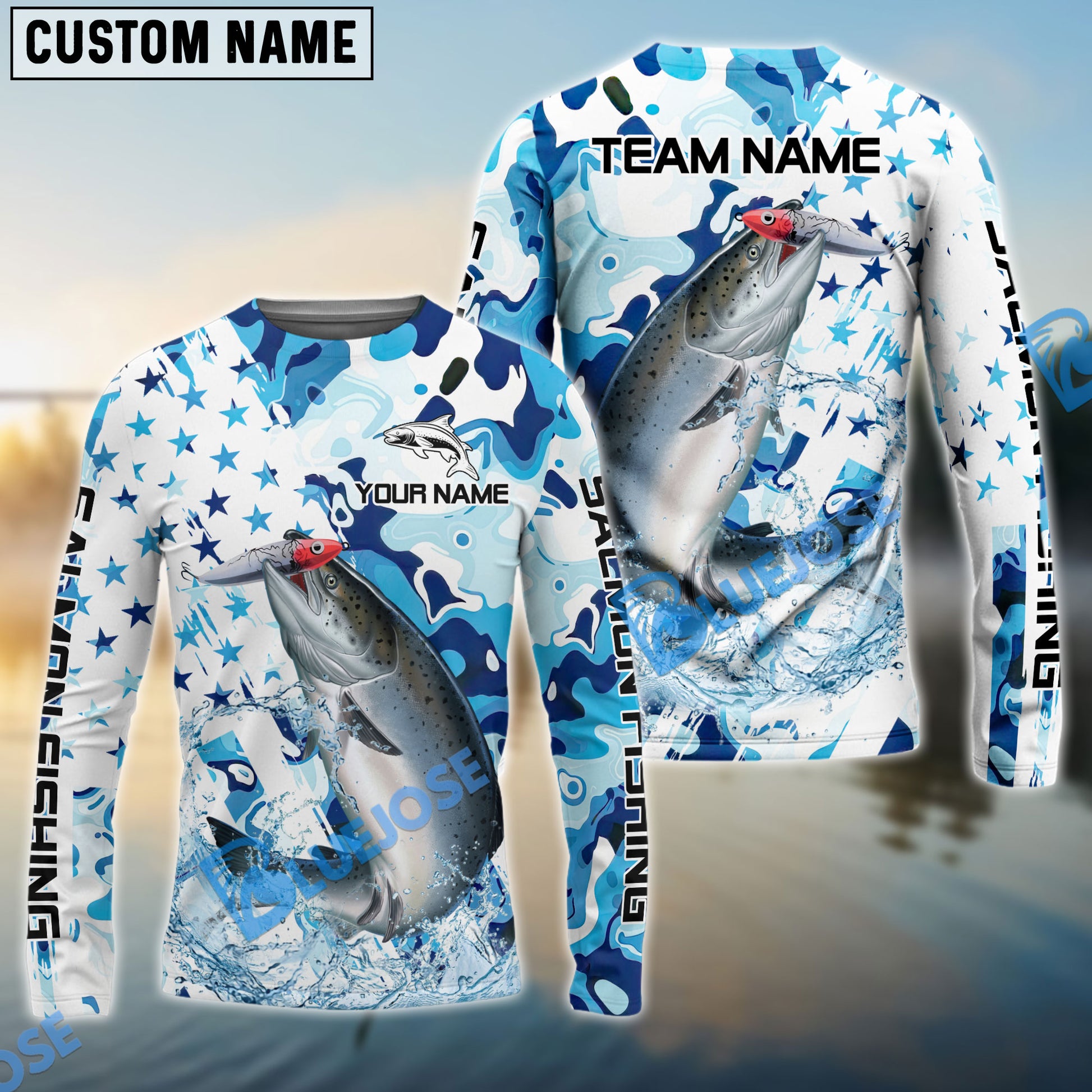 Bluejose Salmon Fishing Blue White American Flag Custom Name & Team Name 3D Shirts
