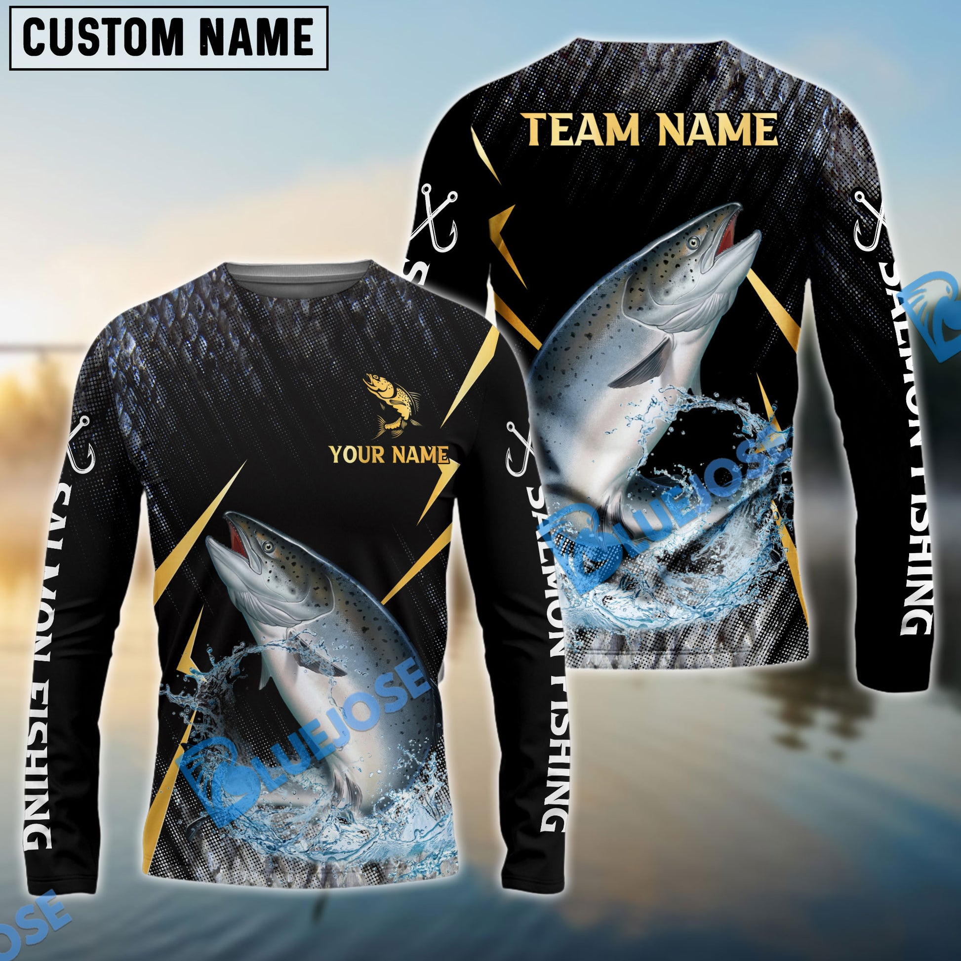 Bluejose Salmon Fishing Golden With Skinfish Pattern Custom Name & Team Name 3D Shirts
