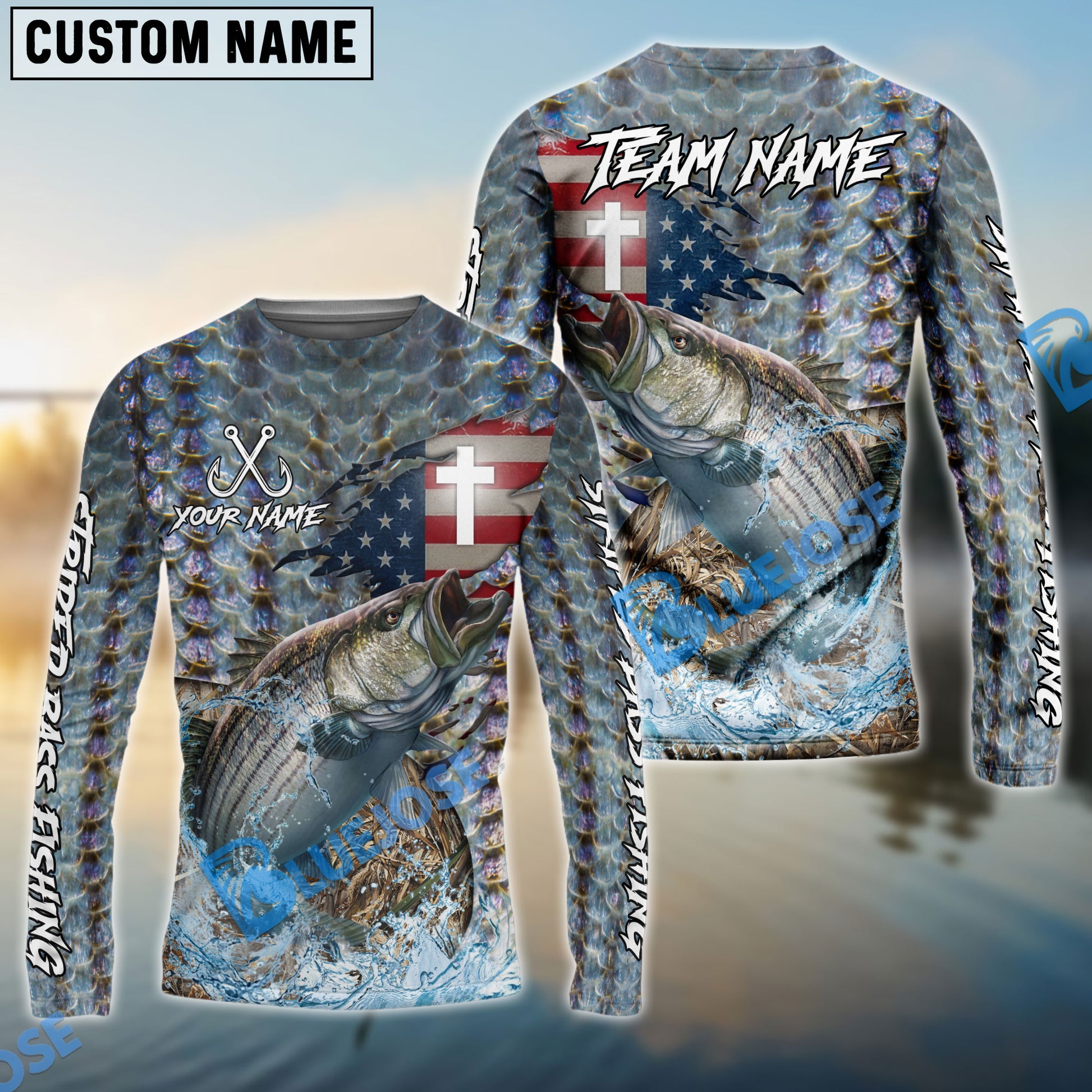 Bluejose Striped Bass Fishing American Flag Camo Cross Skin Custom Name & Team Name 3D Shirts