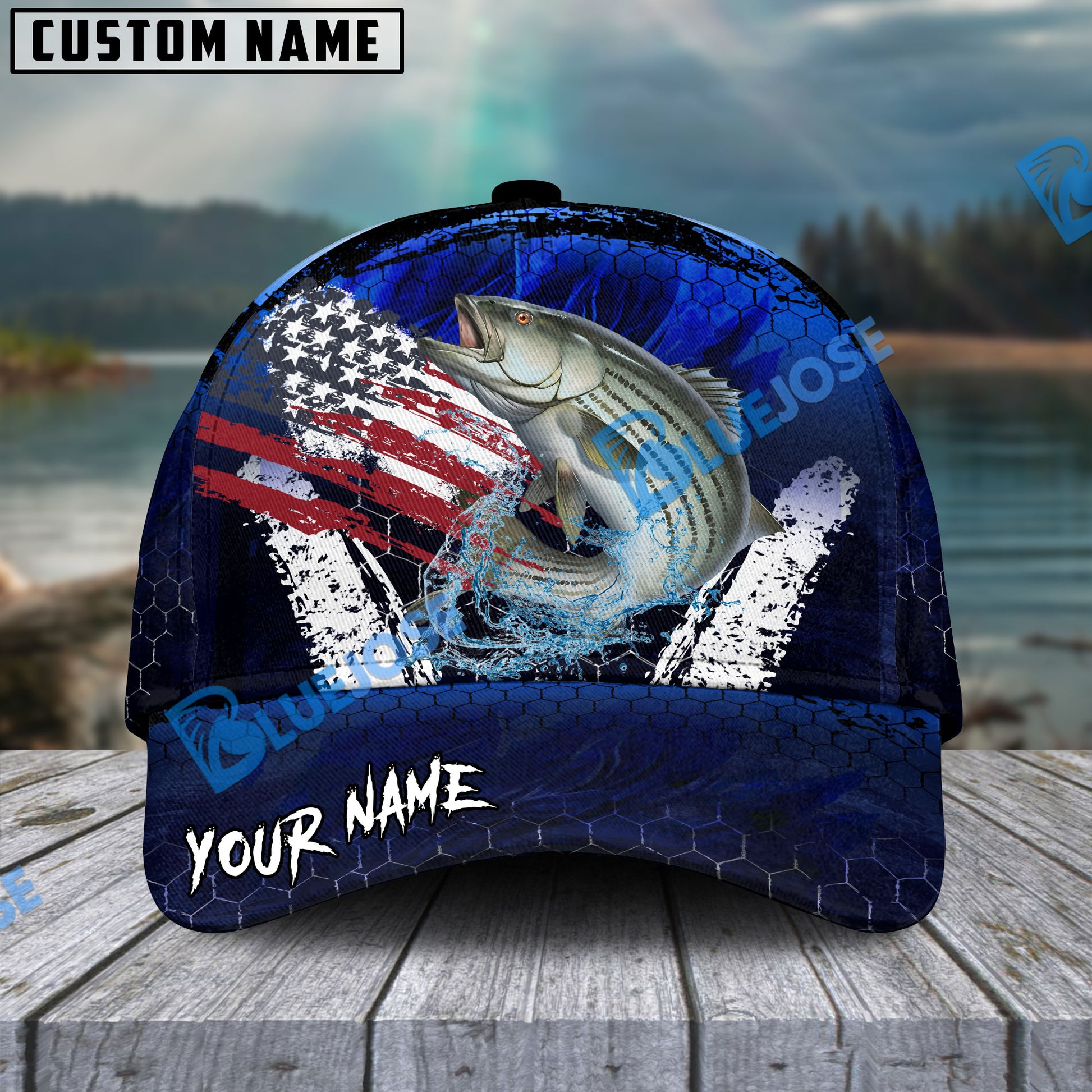 Bluejose Striped Bass Fishing Dark Blue Scratch American Flag scratch Sport Personalized Cap
