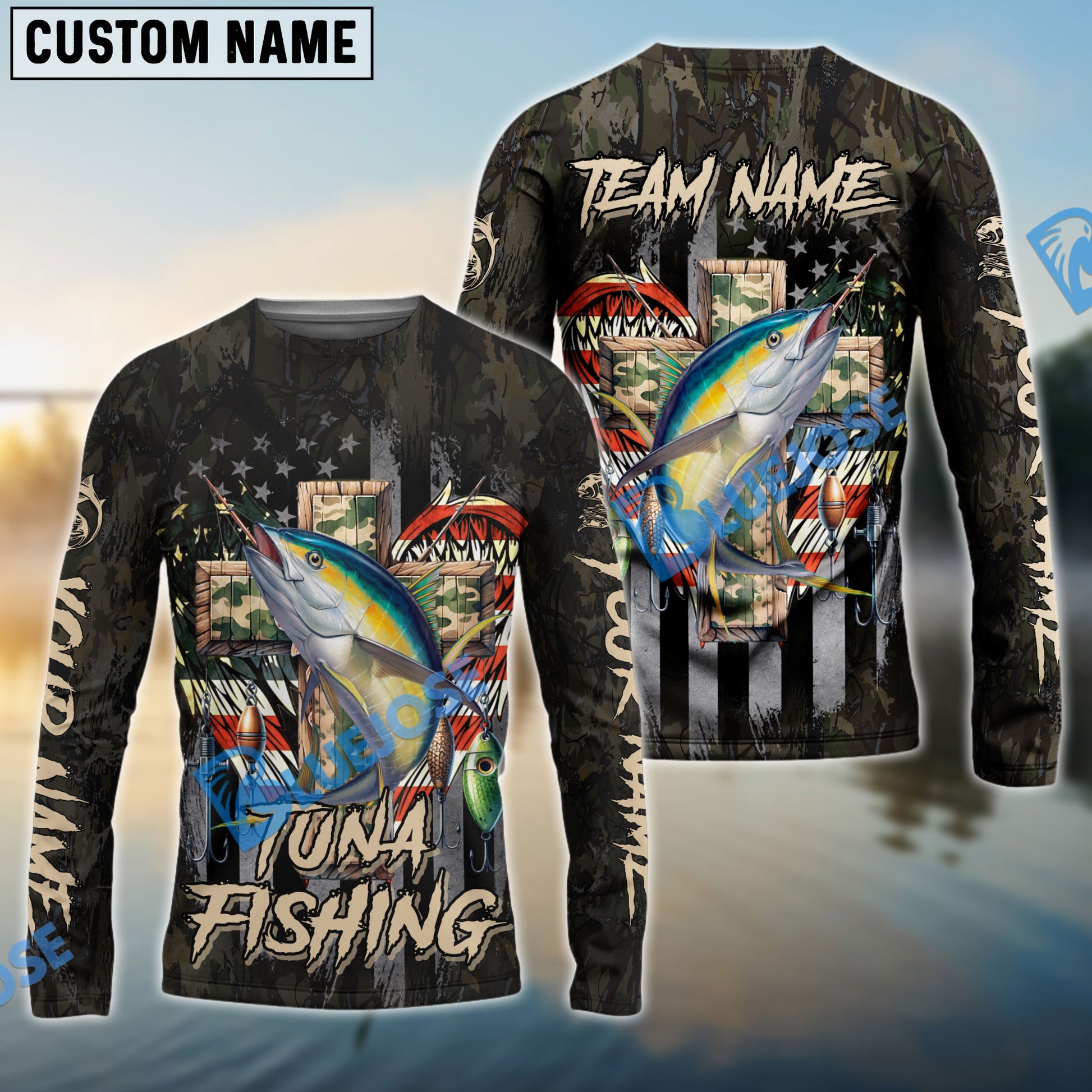 Bluejose Tuna Fishing American Flag Camo Cross Gear Custom Name & Team Name 3D Shirts