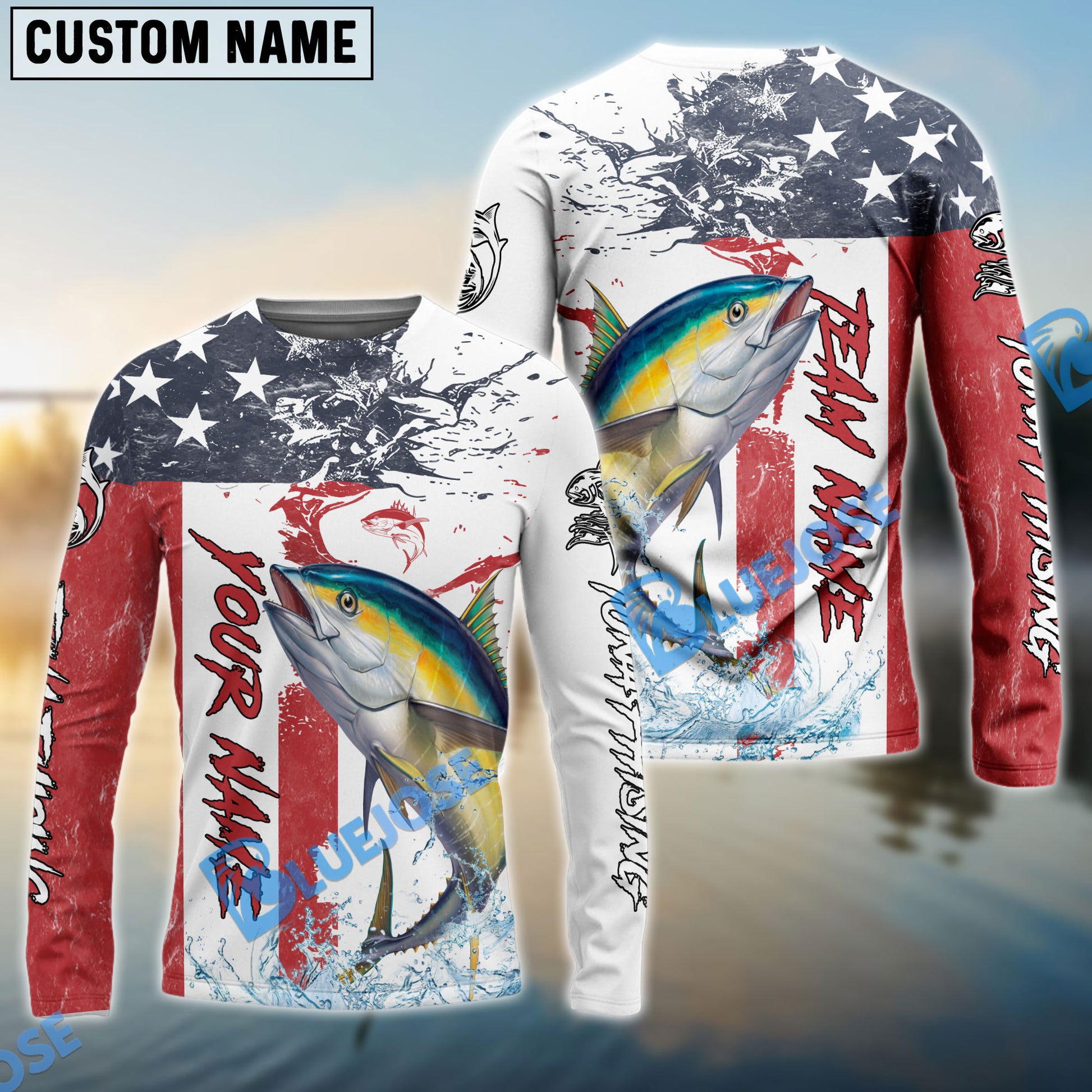 Bluejose Tuna Fishing American Flag Red Blue Seawave Custom Name & Team Name 3D Shirts