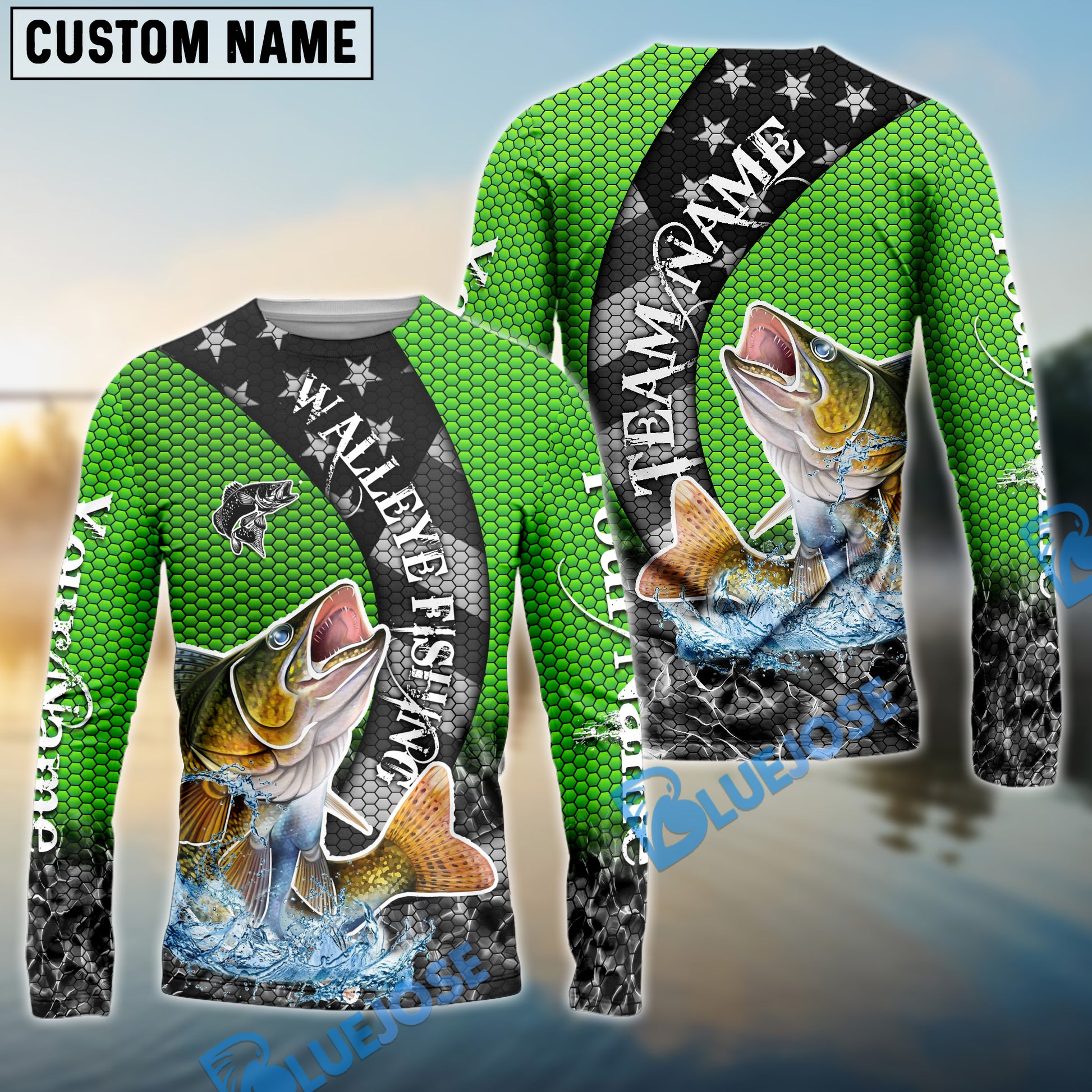 Bluejose Walleye Fishing American Flag Green Stars Custom Name & Team Name 3D Shirts