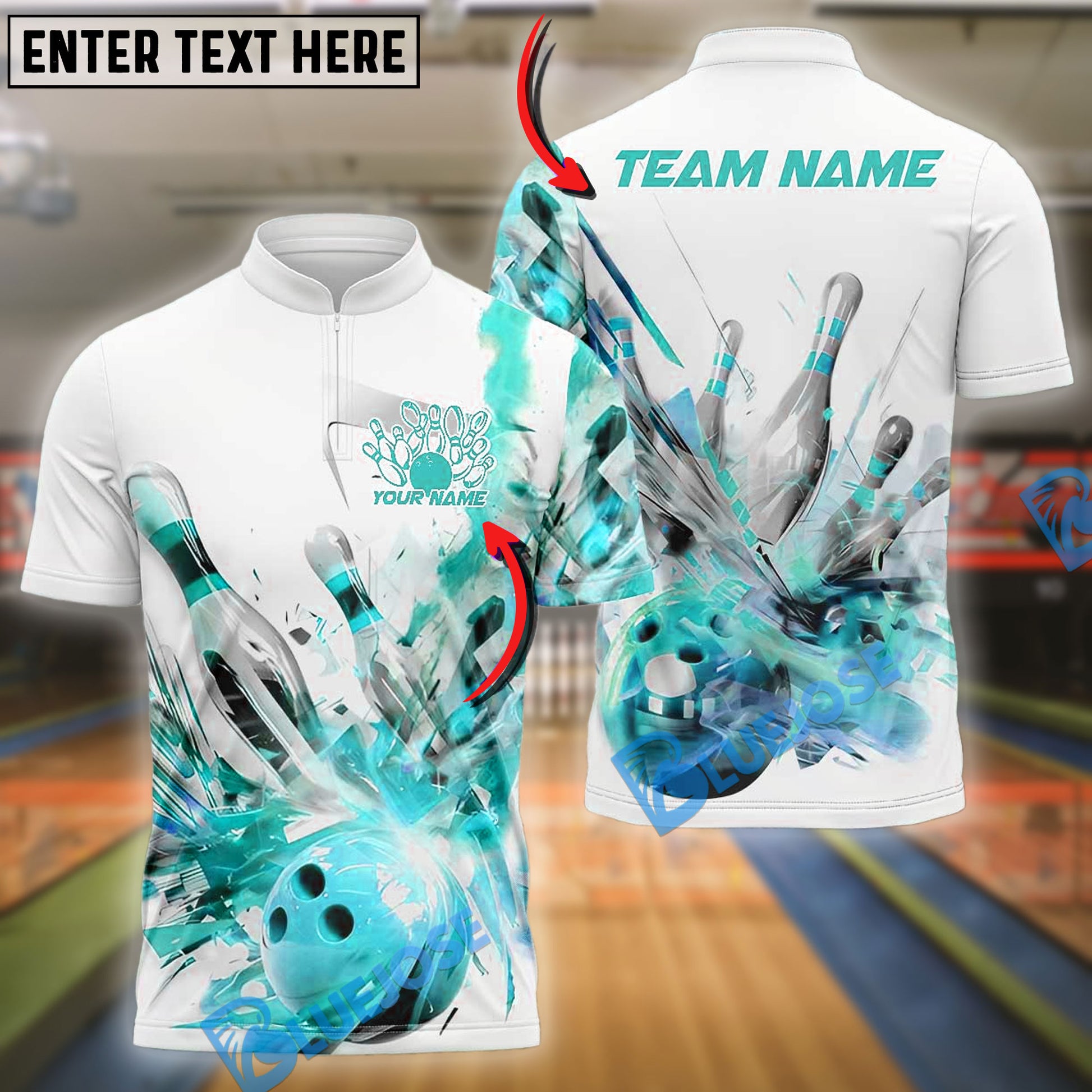 BlueJose Bowling And Pins White Spin Paint Customized Name, Team Name 3D Shirt (4 Colors)