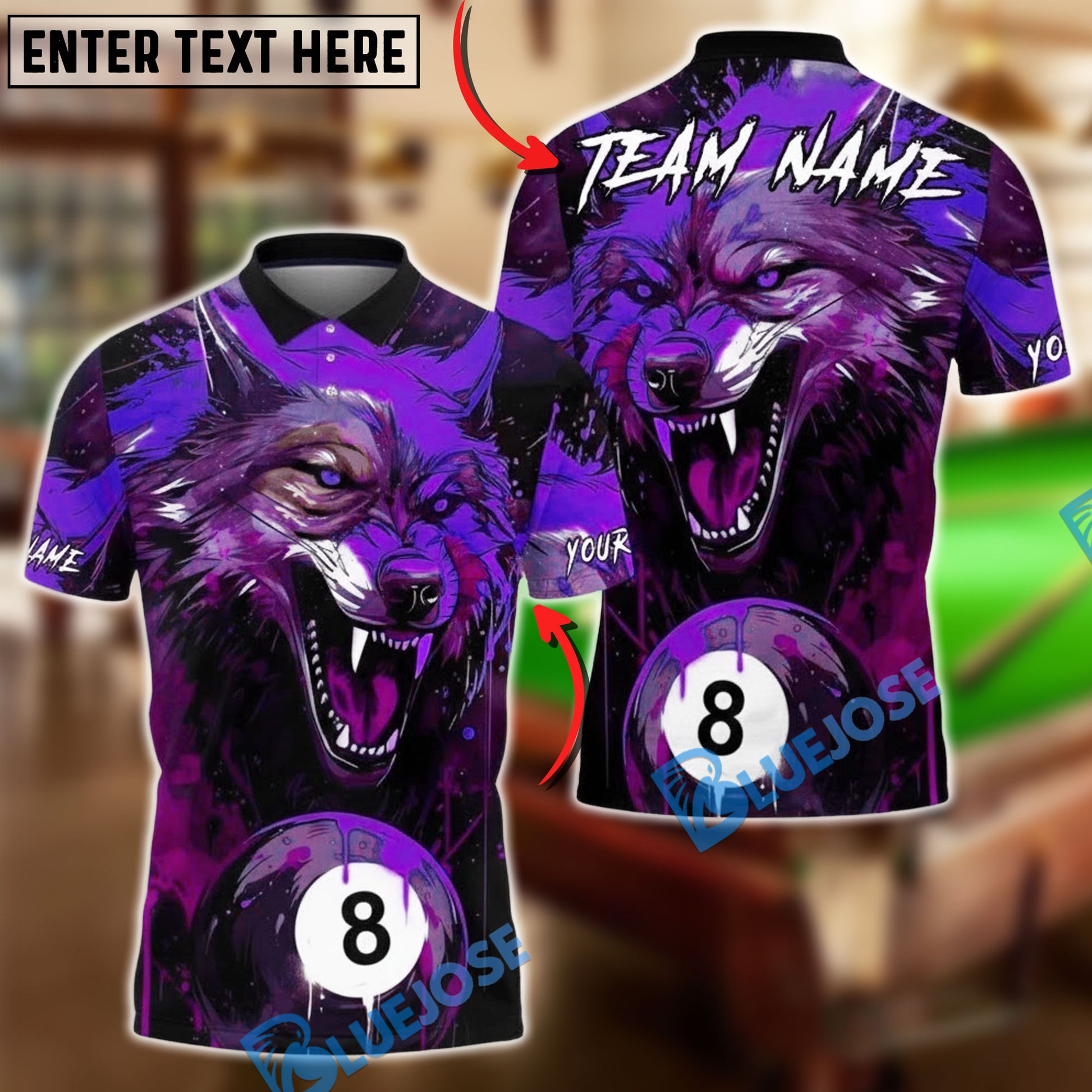 BlueJose Billiards 8-Ball Blood Wolf Design Personalized Name, Team Name Unisex Shirt (4 Colors)