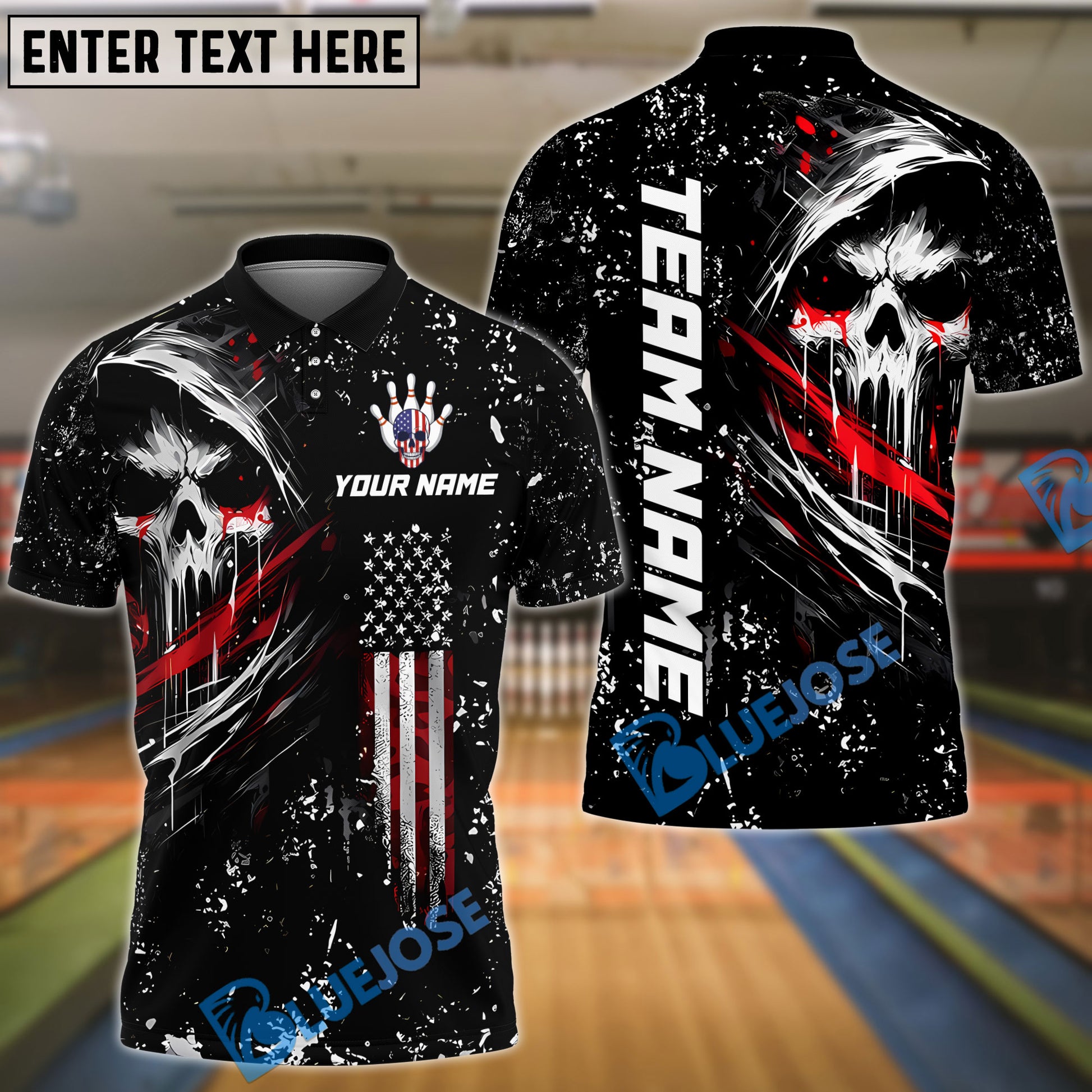 BlueJose Bowling And Pins Grim Skull with American Flag Personalized Name, Team Name Shirt