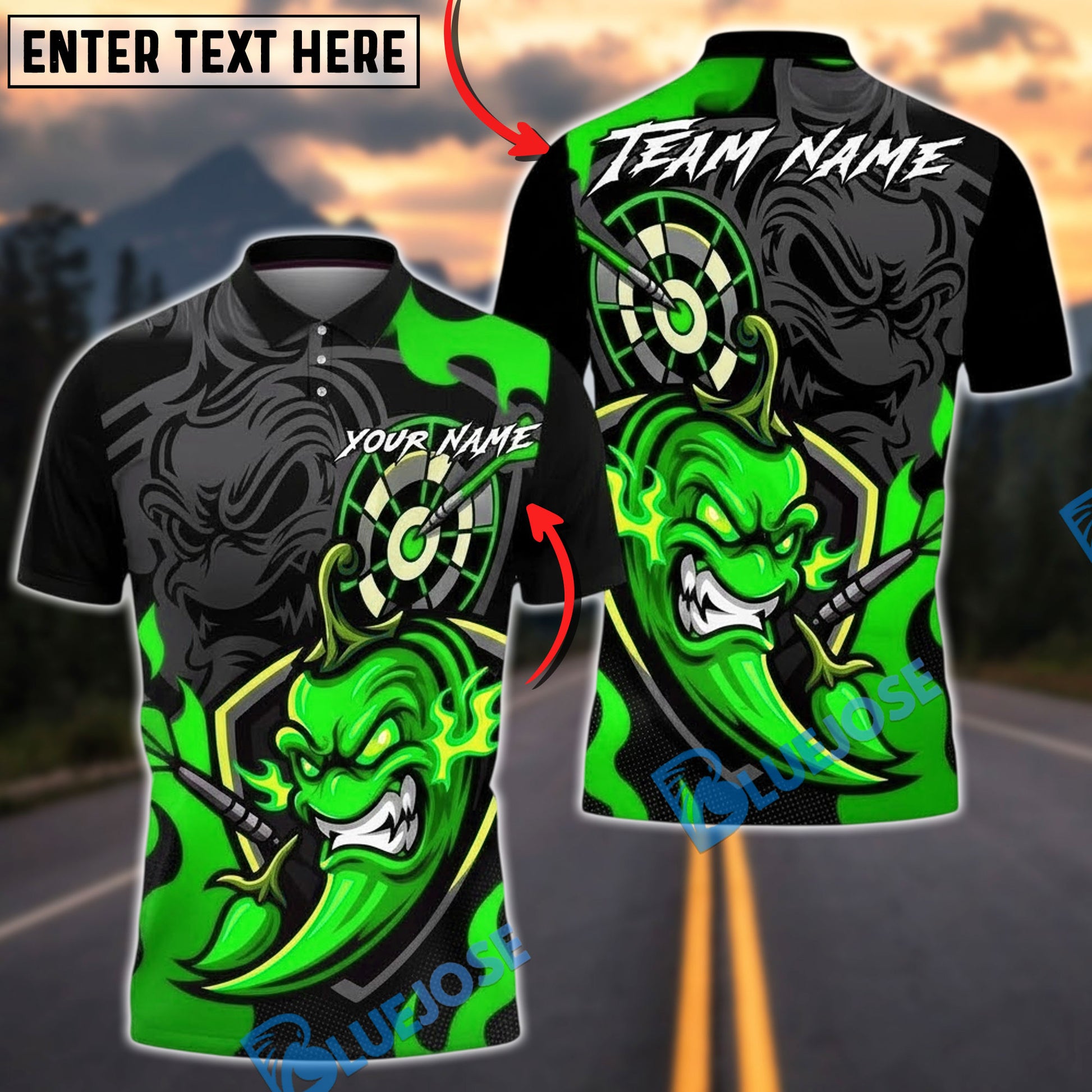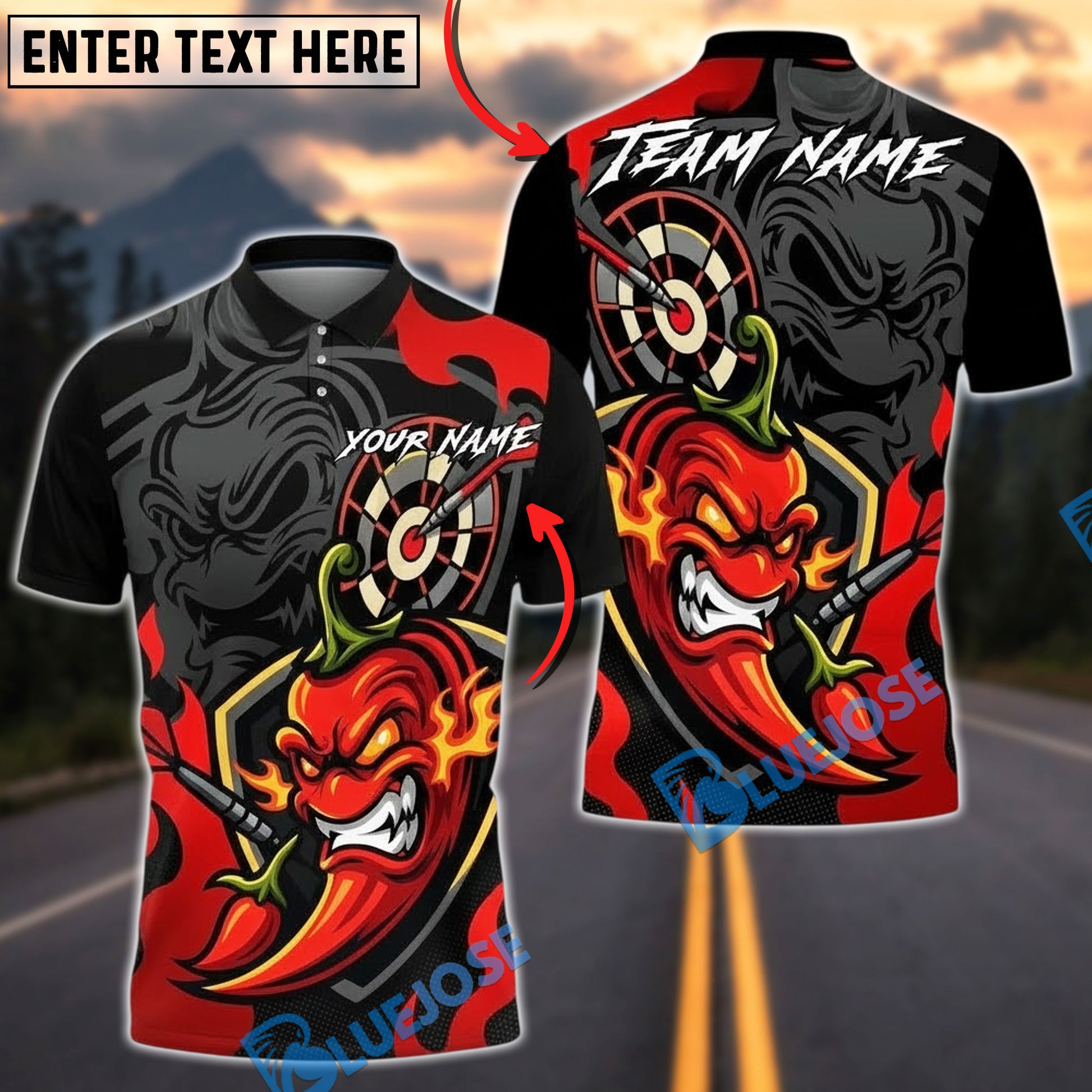 BlueJose Darts Angry Chili Flame Target Design Personalized Name, Team Name Unisex Shirt (4 Colors)