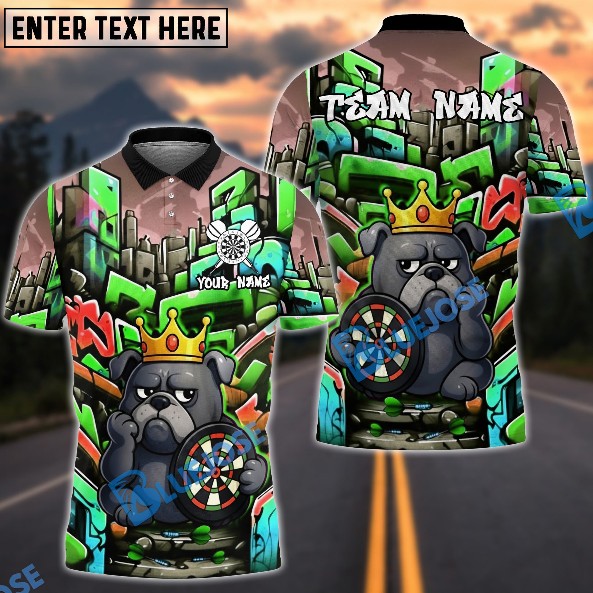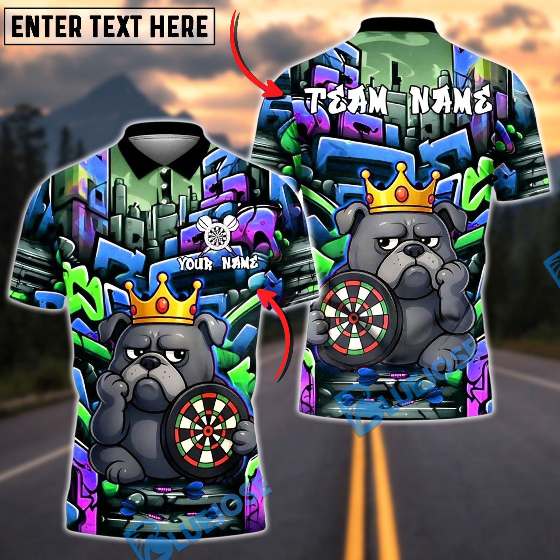 BlueJose Darts Bulldog King Graffiti Crown Customized Name, Team Name 3D Shirt (4 Colors)