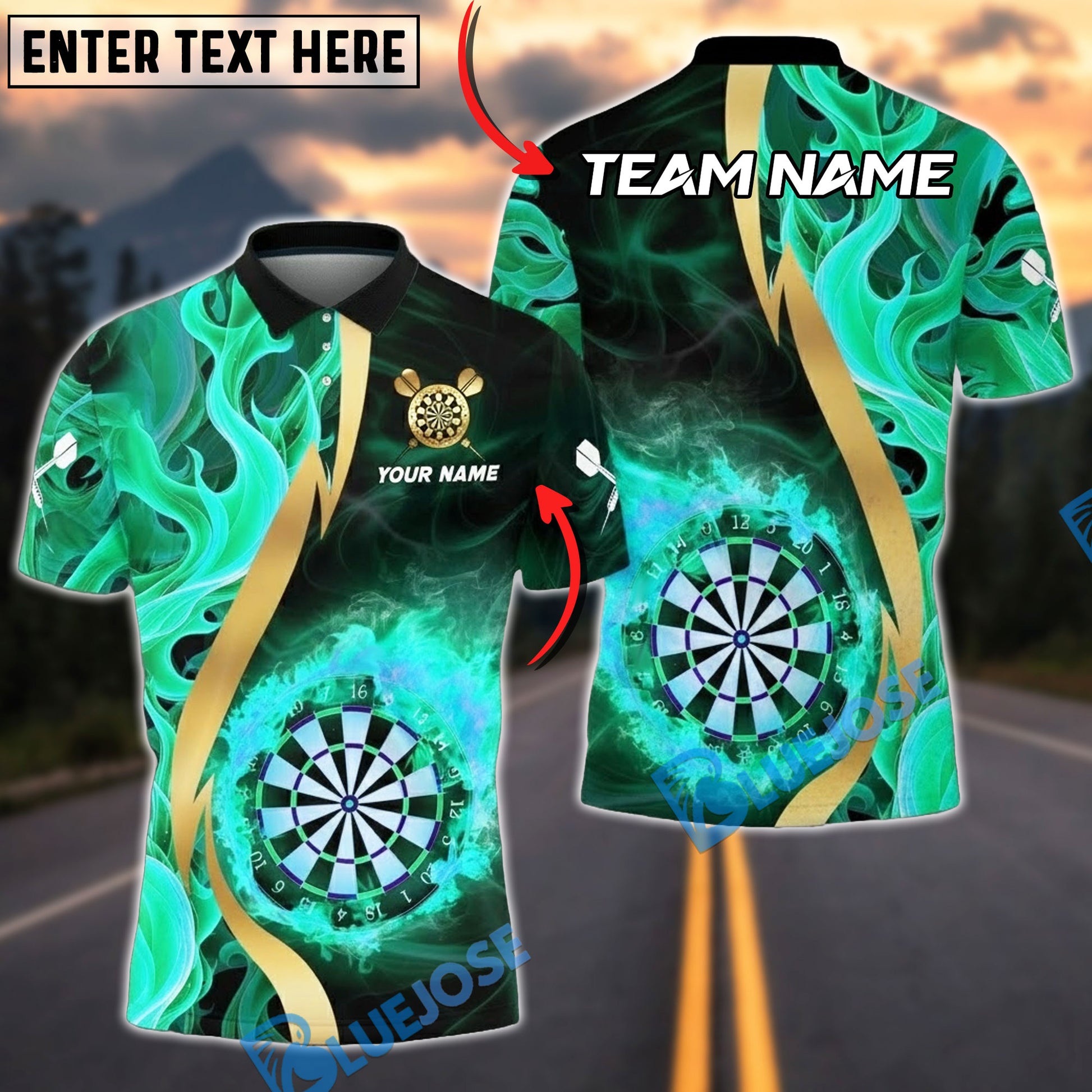 BlueJose Darts Flaming Dartboard Shirt Fire Burst Golden Streak Multicolor Options Personalized Name Shirt (4 Colors)