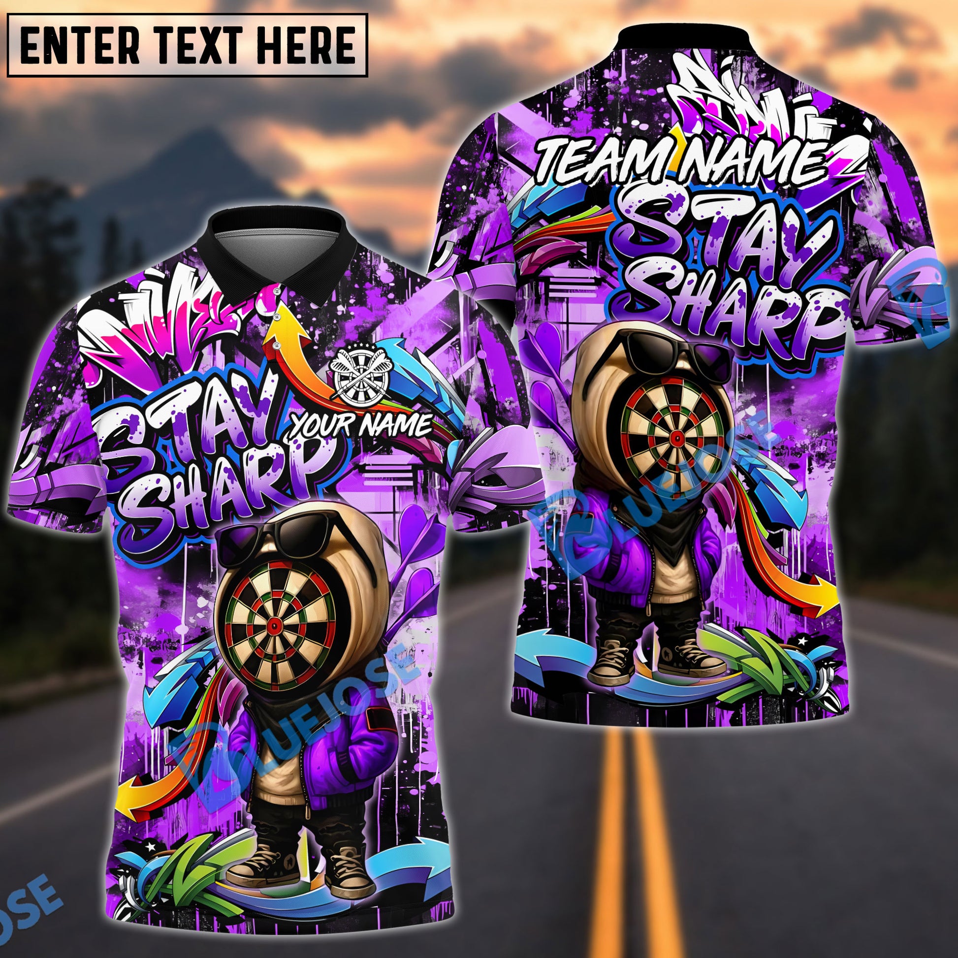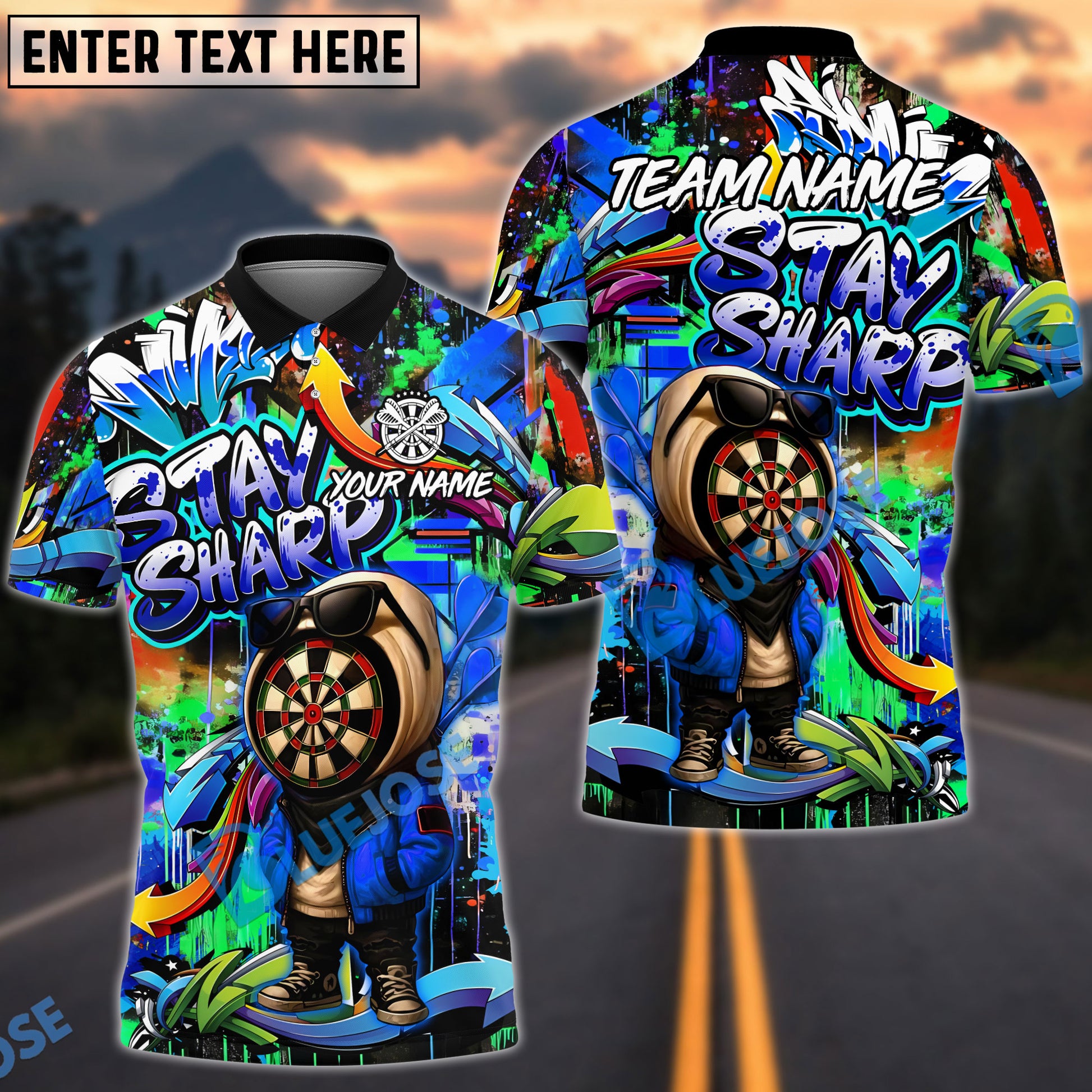 BlueJose Darts Graffiti Character Stay Sharp Personalized Name, Team Name Unisex Shirt (4 Colors)