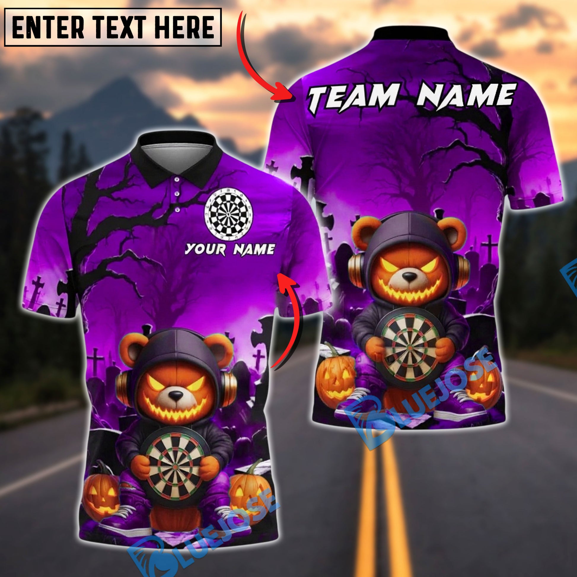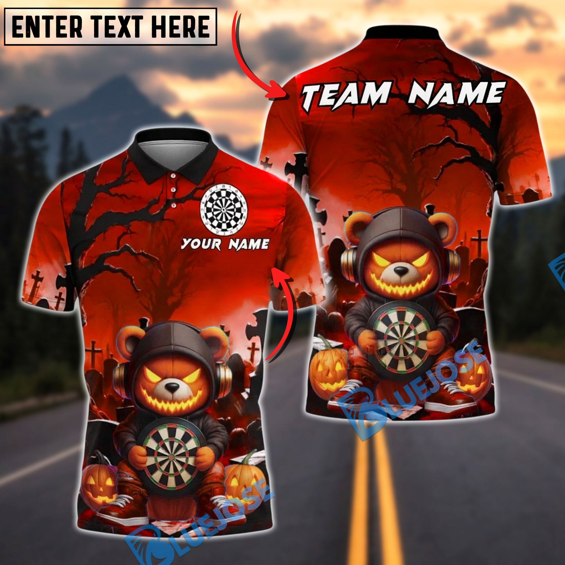 BlueJose Darts Halloween Bear Pumpkin Dartboard Personalized Name, Team Name Unisex Shirt (4 Colors)