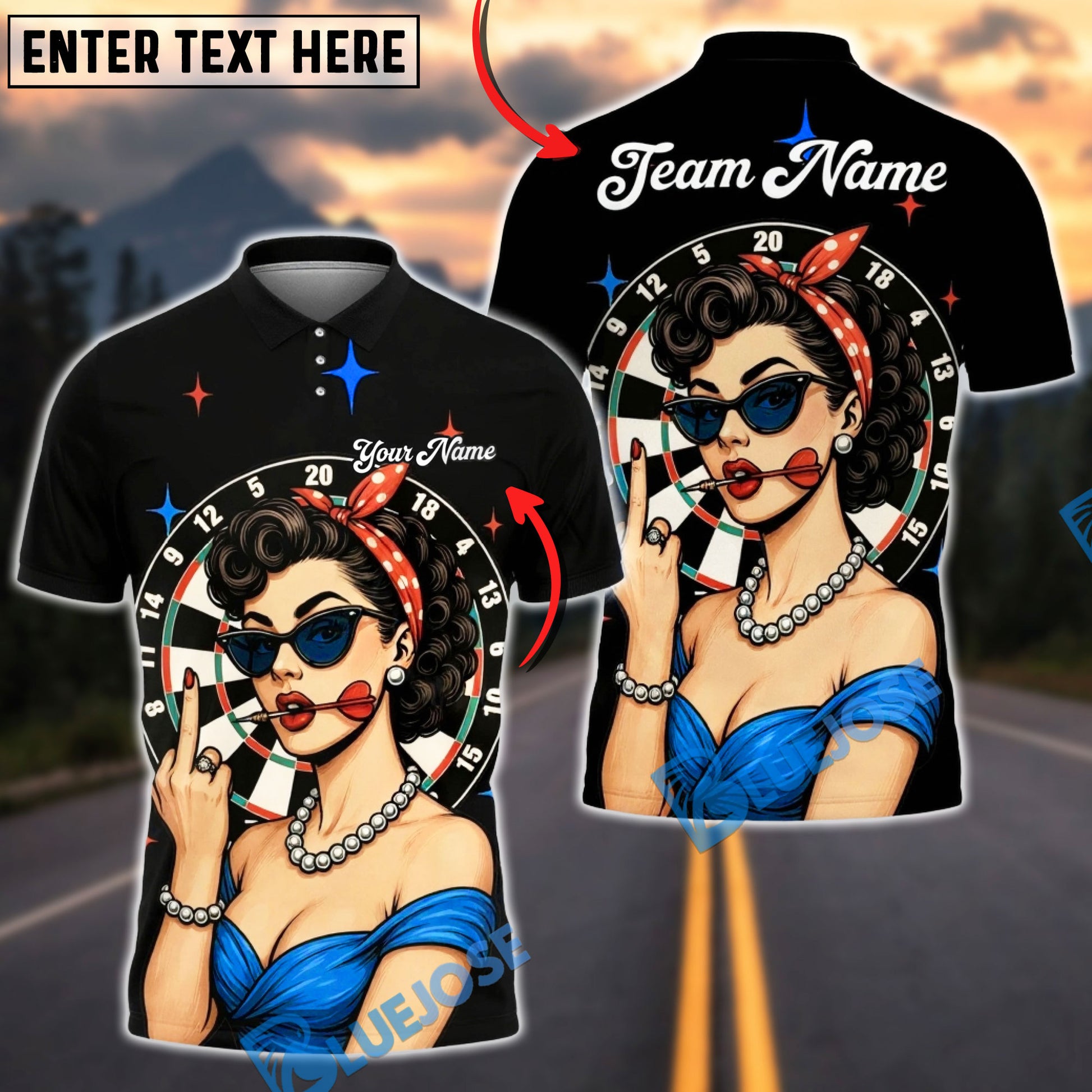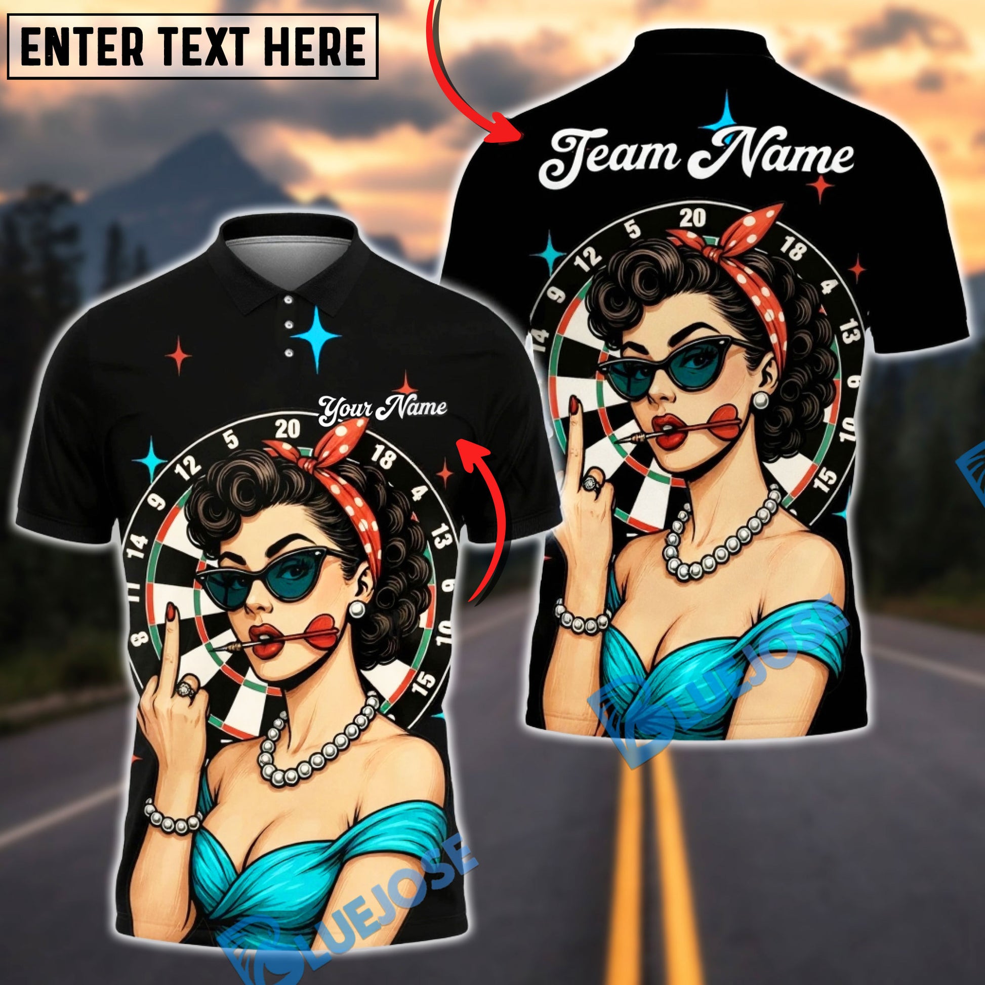 BlueJose Darts Pinup Girl Retro Style Multicolor Options Personalized Name Shirt (4 Colors)
